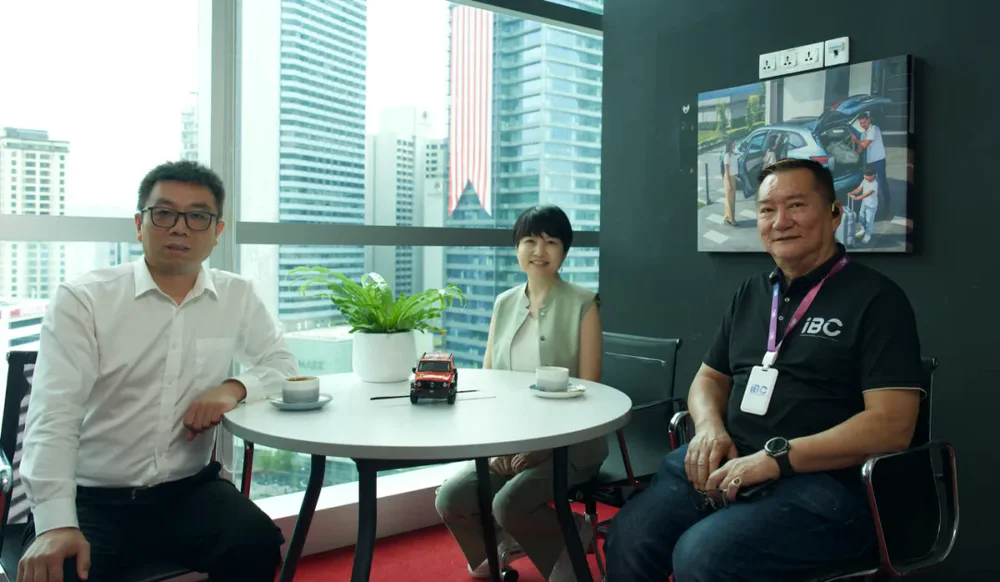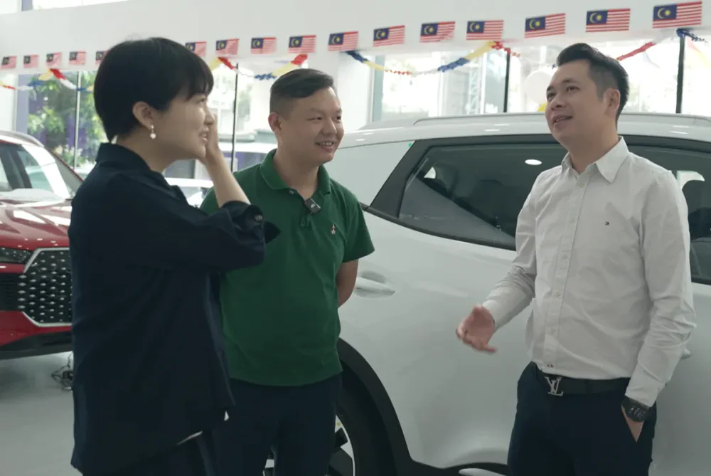 在吉隆坡的奇瑞4S店内,易车公司副总裁、汽车产经总编辑陈昊(左);Joystar经销商集团联合创始人王永利(中);4S店总经理David (右)