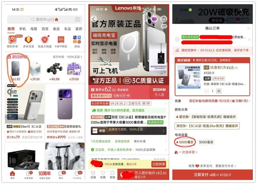 我是在PDD上找的价格,原价是138.9元,先手动搜到联想磁吸充电宝,再重返百亿补贴可以显示62.82元。但要注意,这价格默认是3000mAh版本,切换5000mAh版本是68.77元,贵6块钱而已。它甚至比疑似贴牌的飞利浦DLP9505还要便宜,价格只要小米那款的零头,牌子也够大。