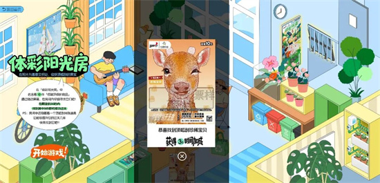 中国体育彩票创新打造的“体彩光合公寓绿色生活顶呱刮”H5互动,将一座“会呼吸”的绿色生态公寓搬进了手机里,让绿色生活玩出花样。通过AR扫一扫、趣味躲避游戏和环保寻物的互动任务,将运动健康、情绪解压、低碳环保等理念变成好玩的游戏体验。比如探索阳光房间找寻环保痕迹可以学到低碳环保知识,玩躲避游戏时还能得到健康运动的小提示。互动活动的开展不仅让群众获得一次游戏体验,更是绿色生活方式的温柔倡导,体彩用年轻人喜欢的互动形式,把绿色理念藏进游戏细节里。