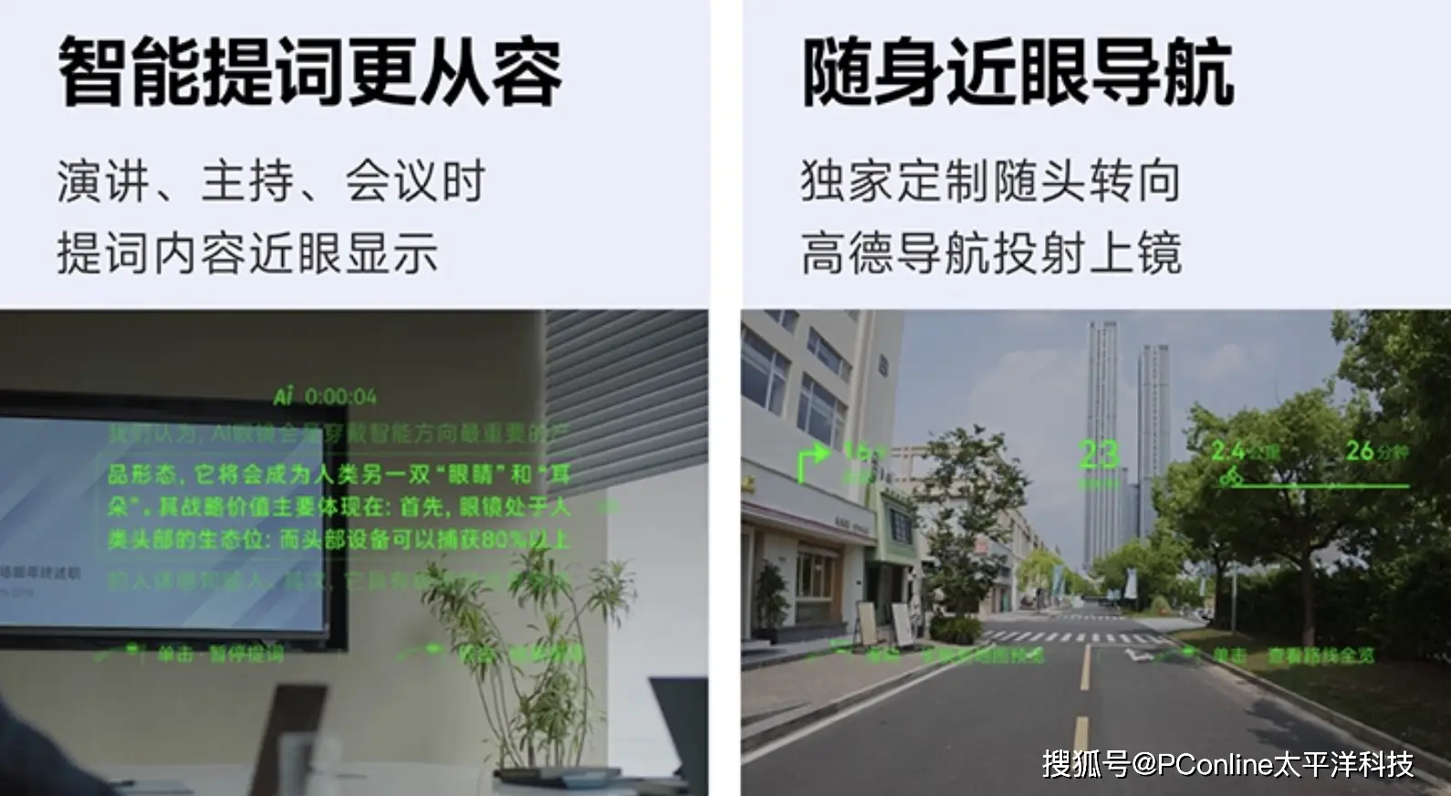 首先是导航。产品深度定制了高德近眼导航系统,路线指引、转向提醒会直接投射到用户的视野中,实现了真正的“抬头显示”,再也不用边走路边低头看手机了。