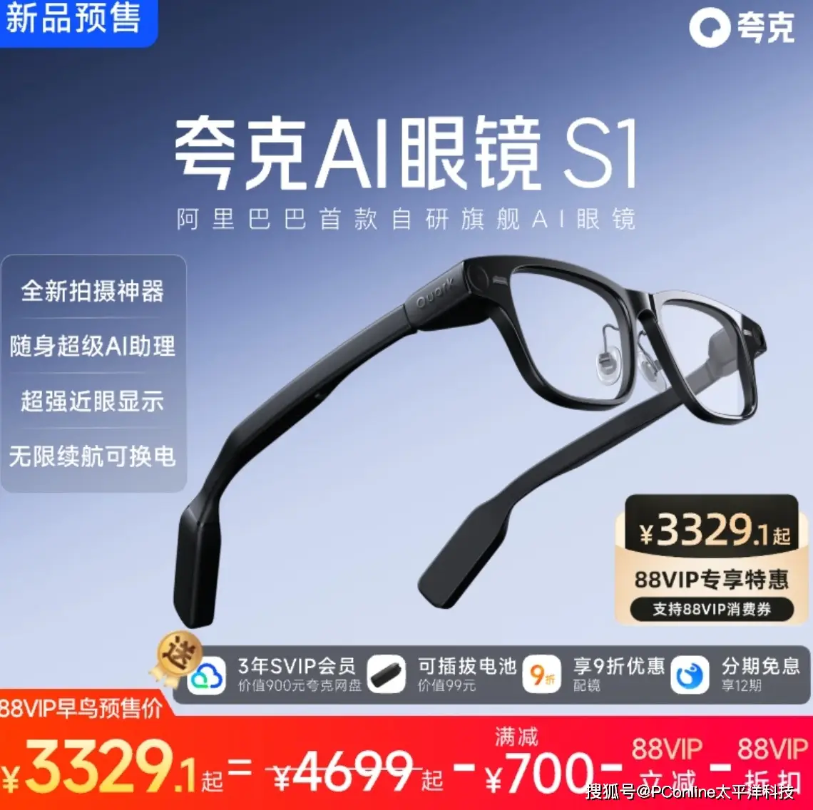 近日,夸克正式推出首款AI眼镜,并同步开启了全渠道预售。如果你是尊贵的88VIP会员,早鸟价仅需3329.1 元即可入手。