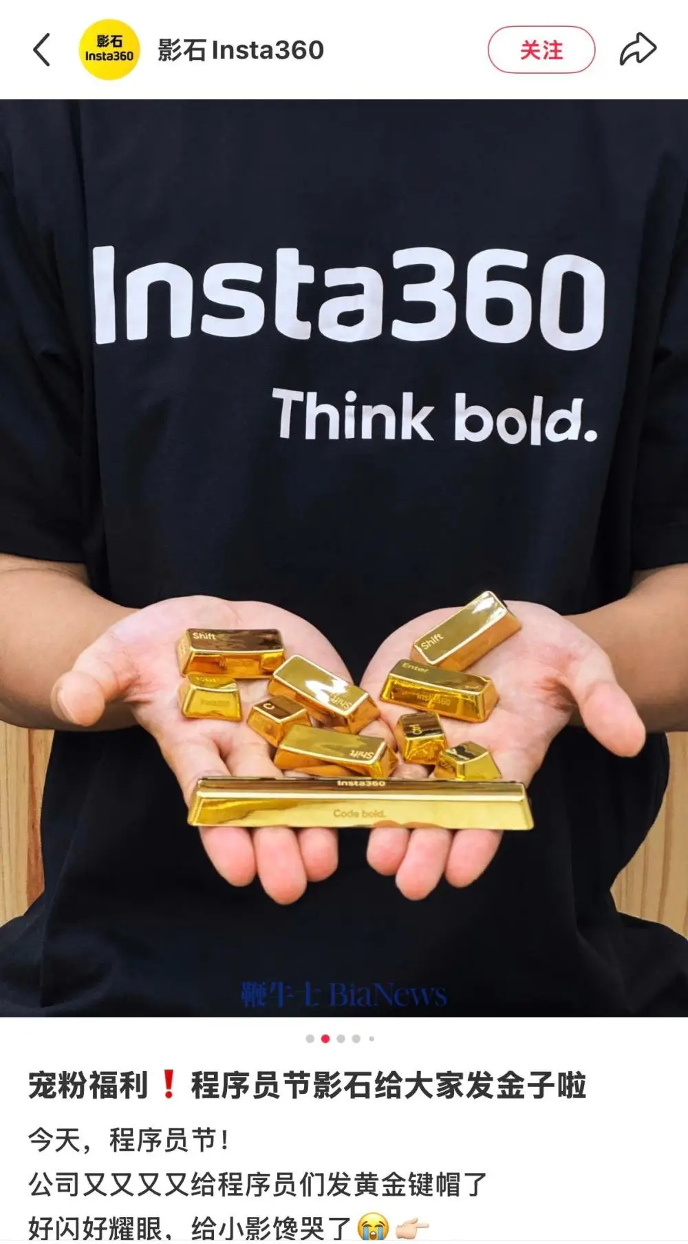 影石称,“今天,程序员节!公司又又又又给程序员们发黄金键帽了。”
