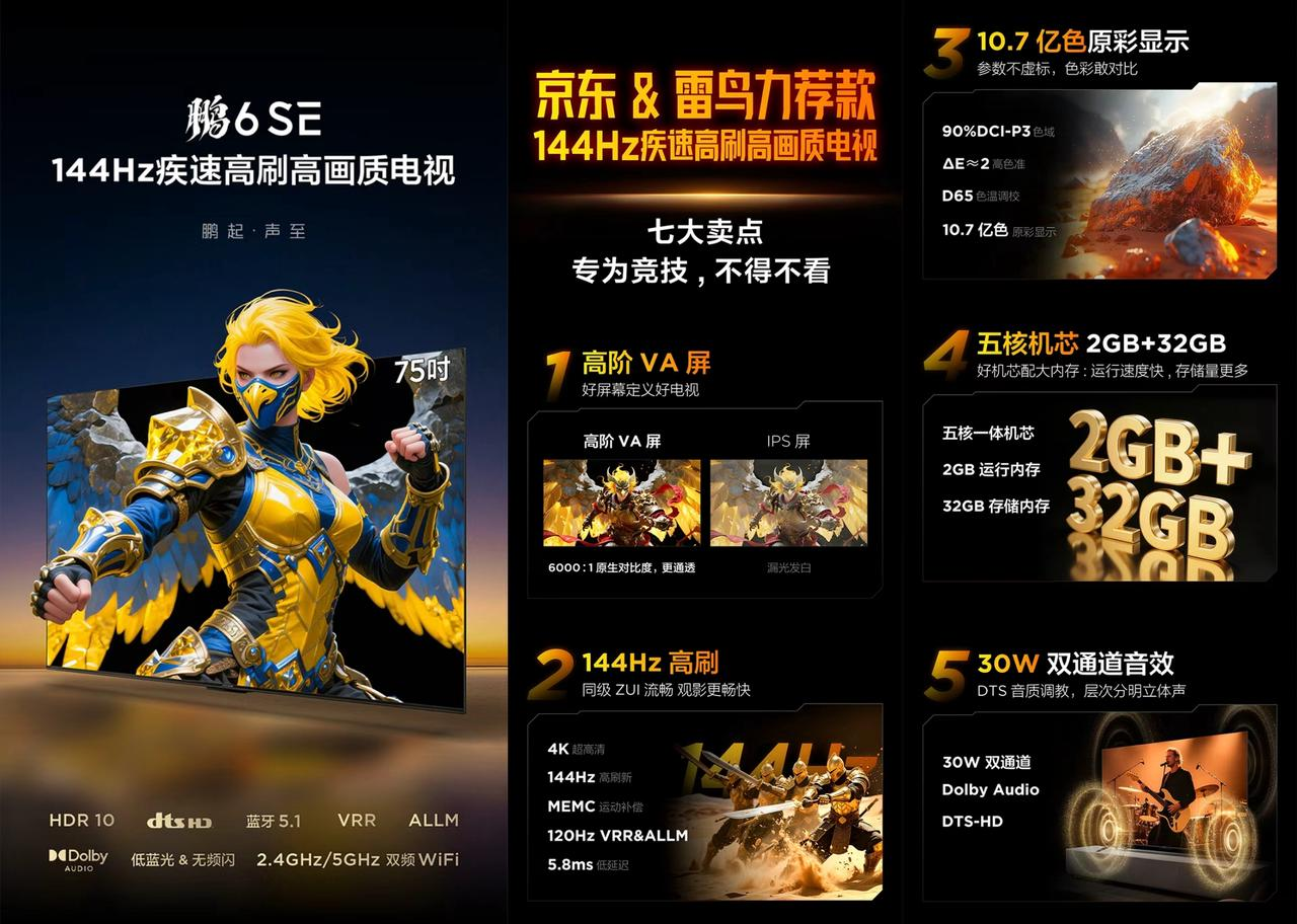 雷鸟鹏6 SE精准卡位“入门级高刷游戏电视”这一细分市场,将原本只存在于高端机型的高阶VA屏、144Hz高刷、MEMC动态补偿等核心配置带入2000-3000元价格带,定位144Hz疾速高速高画质电视,堪称质价比之王。