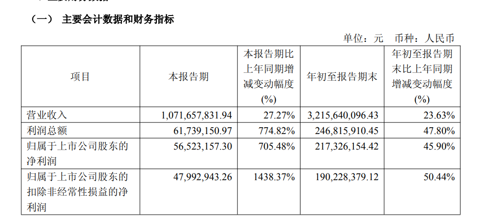 前三季度,科林电气营业收入10.72亿元,同比增长27.27%;归属于上市公司股东的净利润5652.32万元,同比增长705.48%。