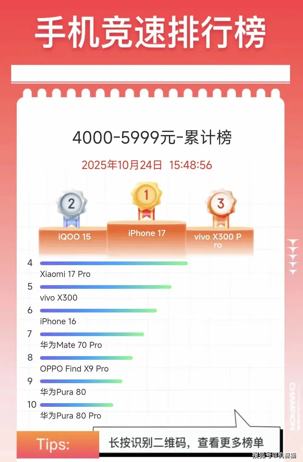 在4000到5999元价位,这也是各家新品发力的主要价格段。目前iPhone 17位列第一,iQOO 15和vivo X300 Pro分别位列第二和第三,小米17 Pro,vivo X300紧随其后。