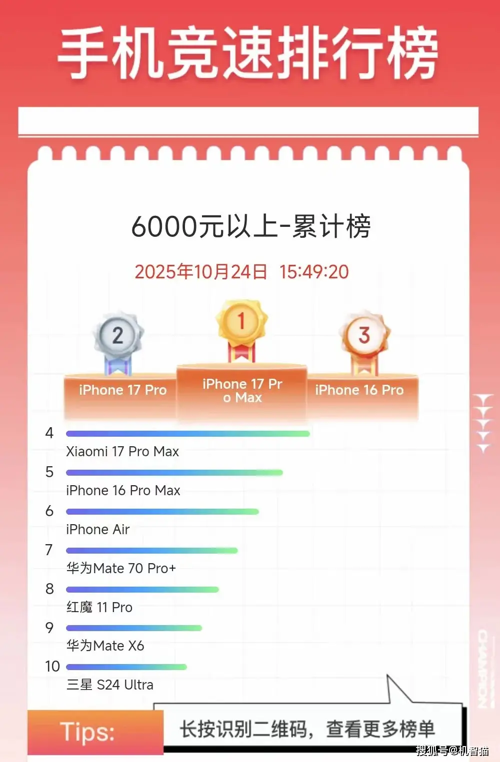 到6000元以上价位,基本是苹果的主场,前三名是iPhone 17 Pro Max、iPhone 17 Pro、iPhone 16 Pro。