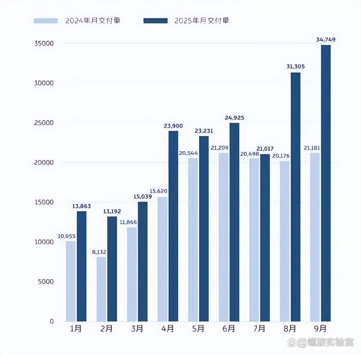 先看销量。今年9月,蔚来交付新车34,749台,同比增长64%。其中,蔚来品牌交付新车13,728台;乐道品牌交付新车15,246台;firefly萤火虫品牌交付新车5,775台。第三季度,蔚来累计交付新车8.7万辆,刷新了季度交付纪录。
