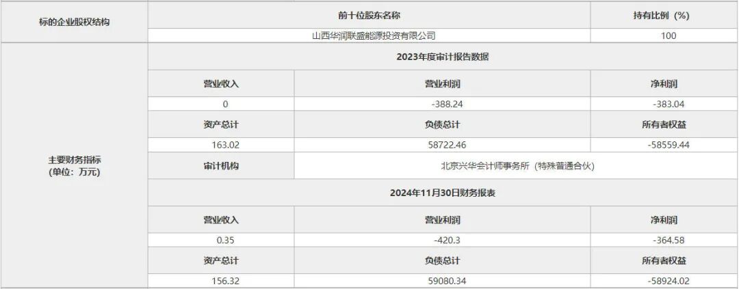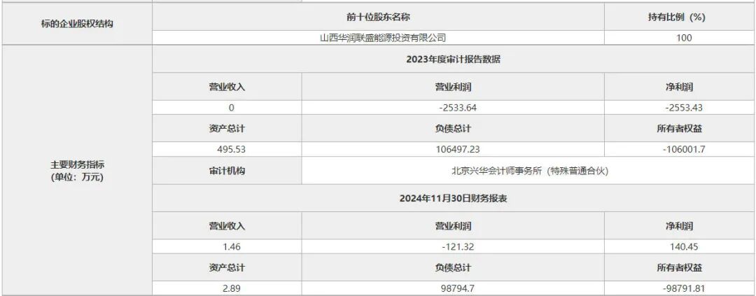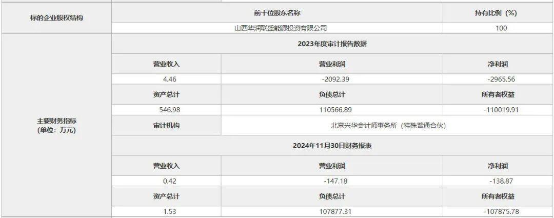 山西交口华润联盛孟家焉煤业有限公司100%股权及相关债权项目(以下简称:孟家焉煤业)转让底价为13亿元。其中,转让方持有标的企业100%股权的转让底价为30326.37万元;转让方持有标的企业104389.03万元债权的转让底价为104389.03万元。