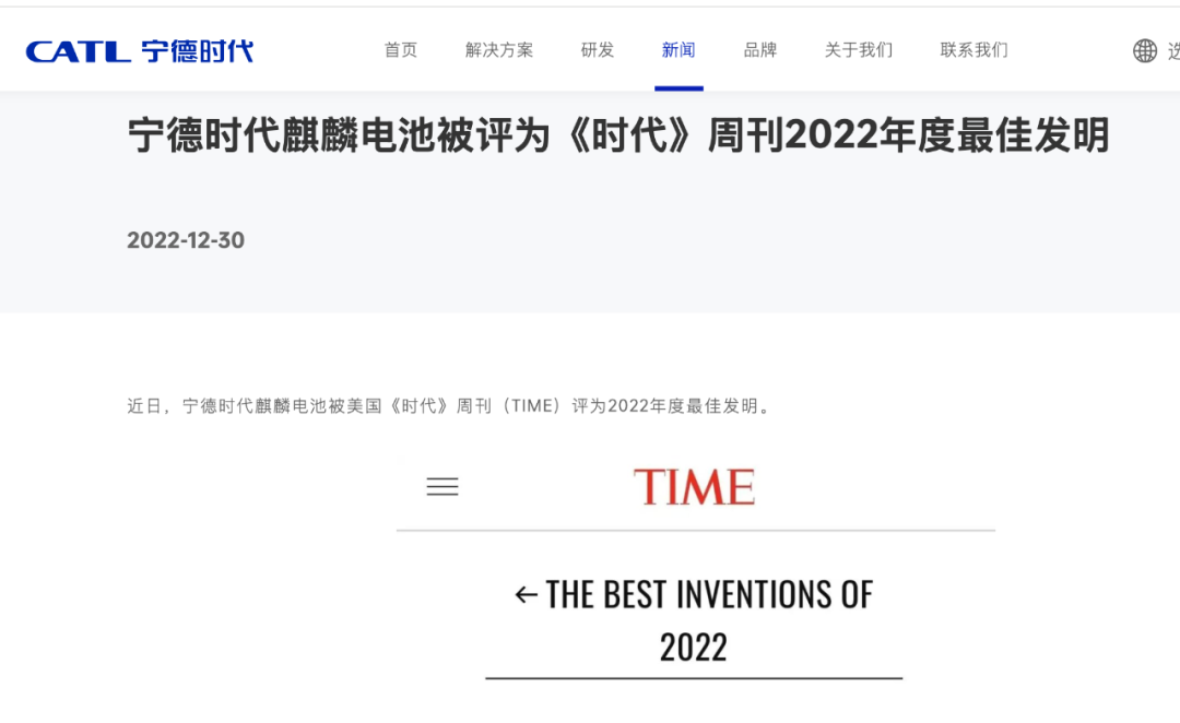 宁德时代官网显示,宁德时代麒麟电池被评为《时代》周刊2022年度最佳发明。