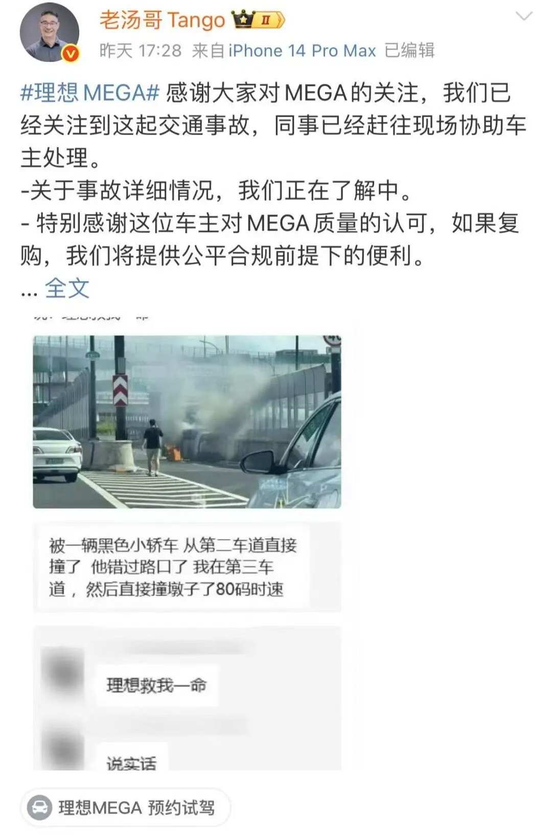 事故发生后,理想汽车产品线负责人汤靖在微博贴出了一张该理想MEGA车主的聊天记录截图。