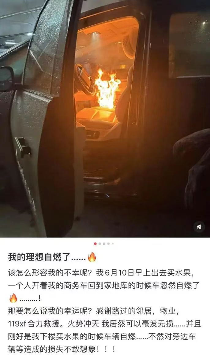 今年6月,哈尔滨车主在社交平台发文称自己的理想MEGA在地下车库停车时突然起火。