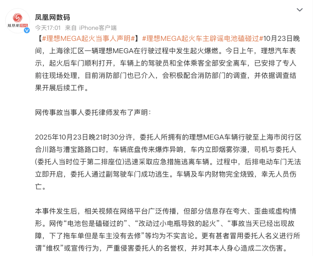 10月23日晚,上海一辆理想MEGA在正常行驶过程中发生起火爆燃。
