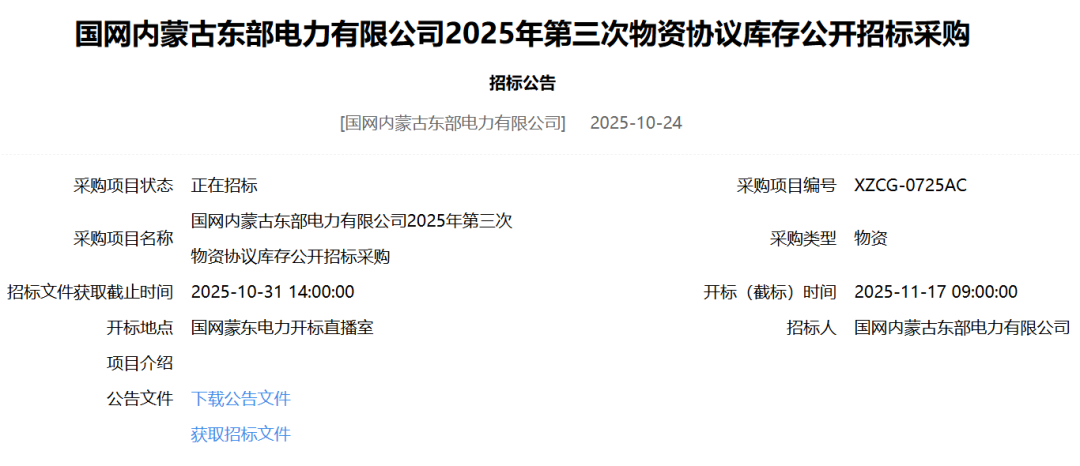 国网内蒙古东部电力有限公司2025年第三次物资协议库存公开招标采购招标公告