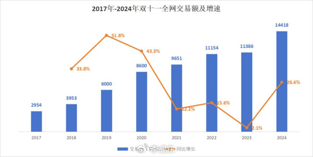 双十一一年比一年卷,消费者对大促已经祛魅了。对应的是全网交易额增长速度不断下滑,只能通过延长时间的方式维持数据增长。