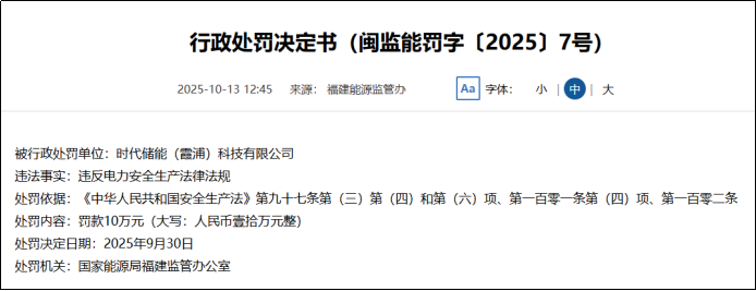 无独有偶。日前,国家能源局福建能源监管办一纸行政处罚决定书,亦将储能安全推到风口浪尖。处罚决定书显示,时代储能(霞浦)科技有限公司(以下简称“霞浦储能”)因违反《安全生产法》多项核心条款而被处以10万元罚款。