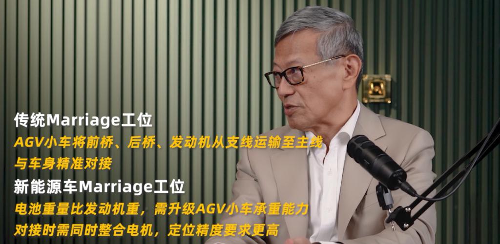 总装车间的经典"Marriage"工位(即 AGV 小车将后桥、前桥、动力总成等从主线外组装后自动移送至车身结合)也随之改变——电池比发动机更重,搭配电机后,整个结合过程与传统模式差异显著。同时,电池作为危险品,对车间的安全、防火要求远高于传统动力总成。