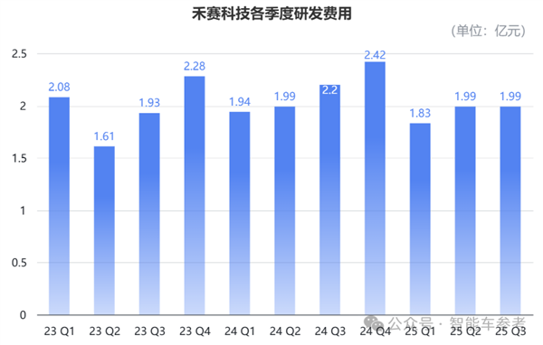 今年第三季度,禾赛的研发开支为1.99亿元,同比下降9.7%,环比基本持平,维持在较稳定水平。