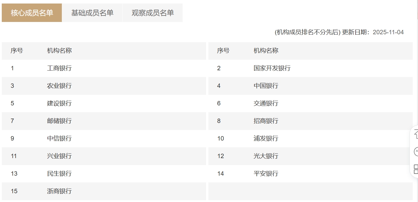 对比近两年市场利率定价自律机制成员机构名单,记者发现,2025年,工商银行、国家开发银行、农业银行、中国银行、建设银行、交通银行、邮储银行、招商银行、中信银行、浦发银行、兴业银行、光大银行、民生银行、平安银行、浙商银行共15家核心成员保持不变。