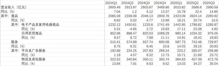 单看25Q3。京东的营收和利润均小幅超市场预期,不过利润却不及我们的预期。25Q3京东的营业收入为2990.59亿元,同比+14.85%(而市场普遍预计同比增13-14%,我们则预计同比+15%);经调整归母净利润为57.96亿元,同比-56%(而市场普遍预计同比降65-70%,而我们则预计同比-35%)。