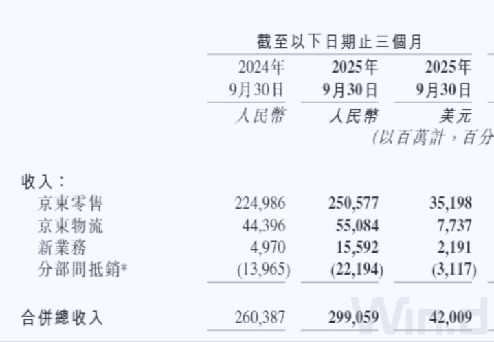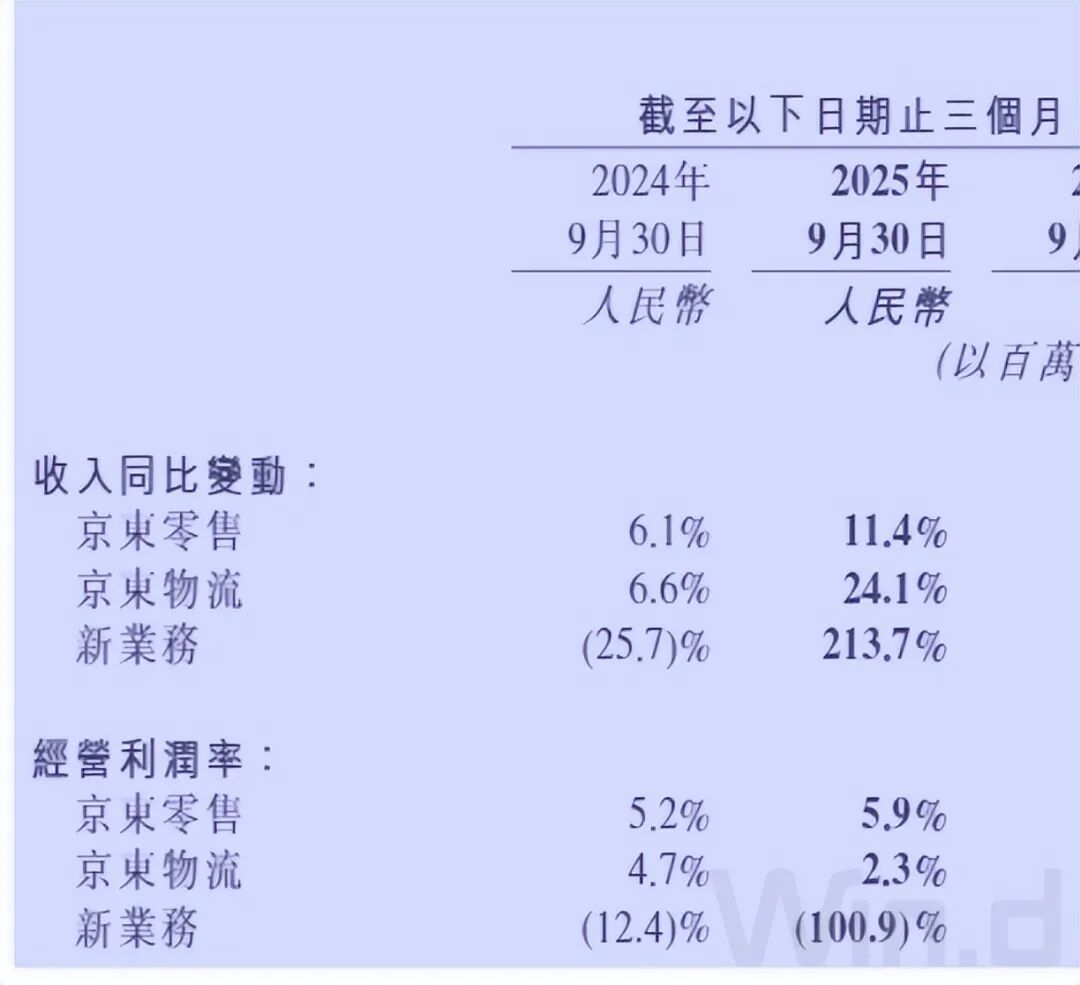 零售依旧是京东的压舱石,三季度完成收入2506亿元,增长11.4%;物流业务收入551亿元,增长24%;新业务收入156亿元,增长两倍多,不过这不足以喜。