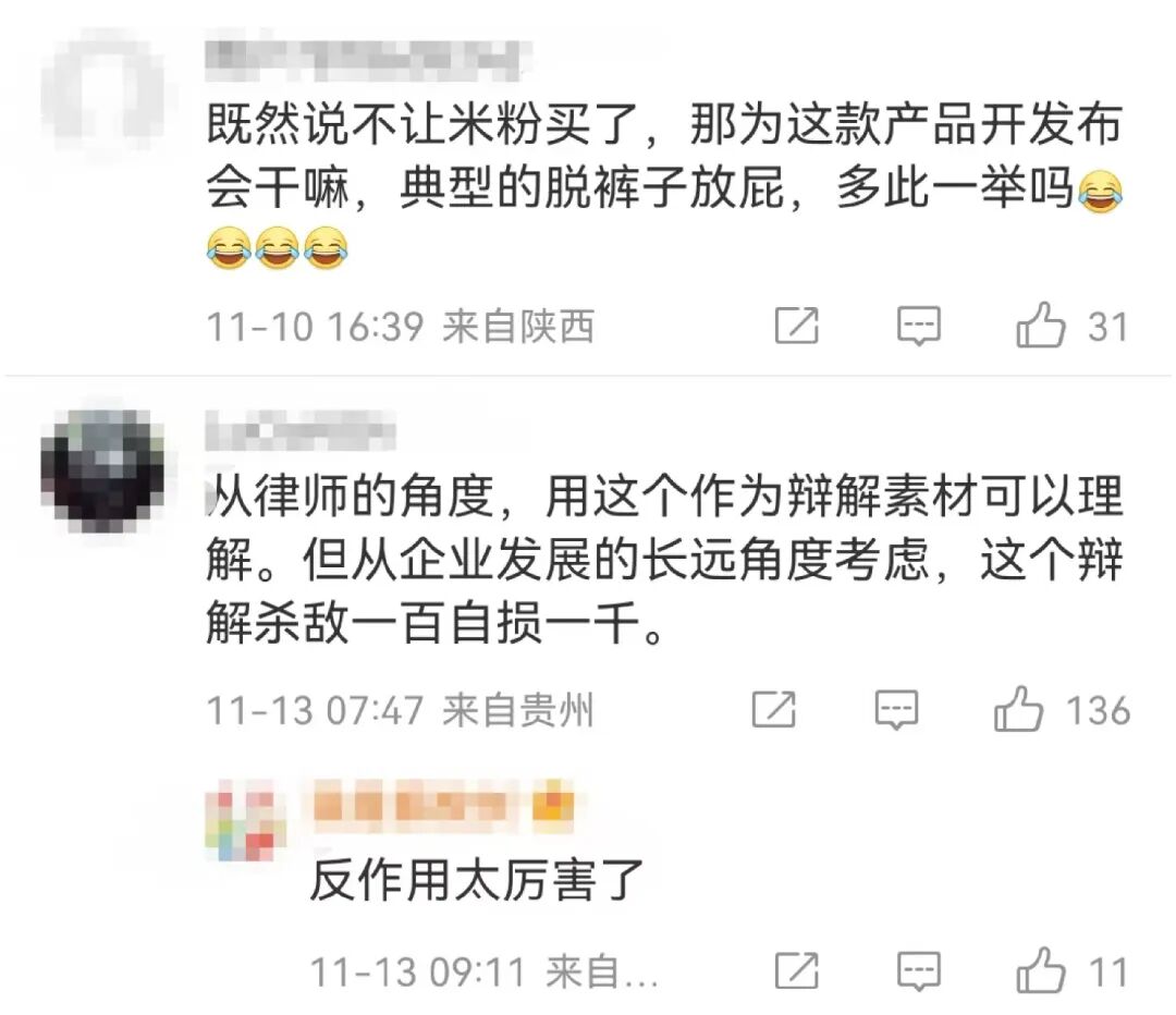 小米的这一部分回应在互联网引起轩然大波。有网友认为这样的解释并不能服众,表示:“既然不让买,为什么要拿出来卖呢?”也有网友认为:“这样的内容作为证据提交本身没有错,只是从企业长远发展来看,这是杀敌一百自损一千。”