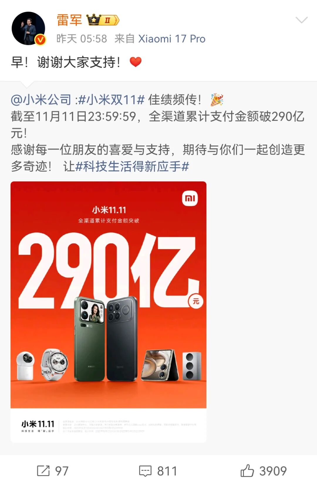 除此之外,近期小米双十一也传来捷报。小米官方凌晨公布战报,截至11月11日23:59:59,全渠道累计支付金额破290亿元。次日早晨,雷军对小米双十一的战绩进行了回应,表示感谢大家对小米的支持。