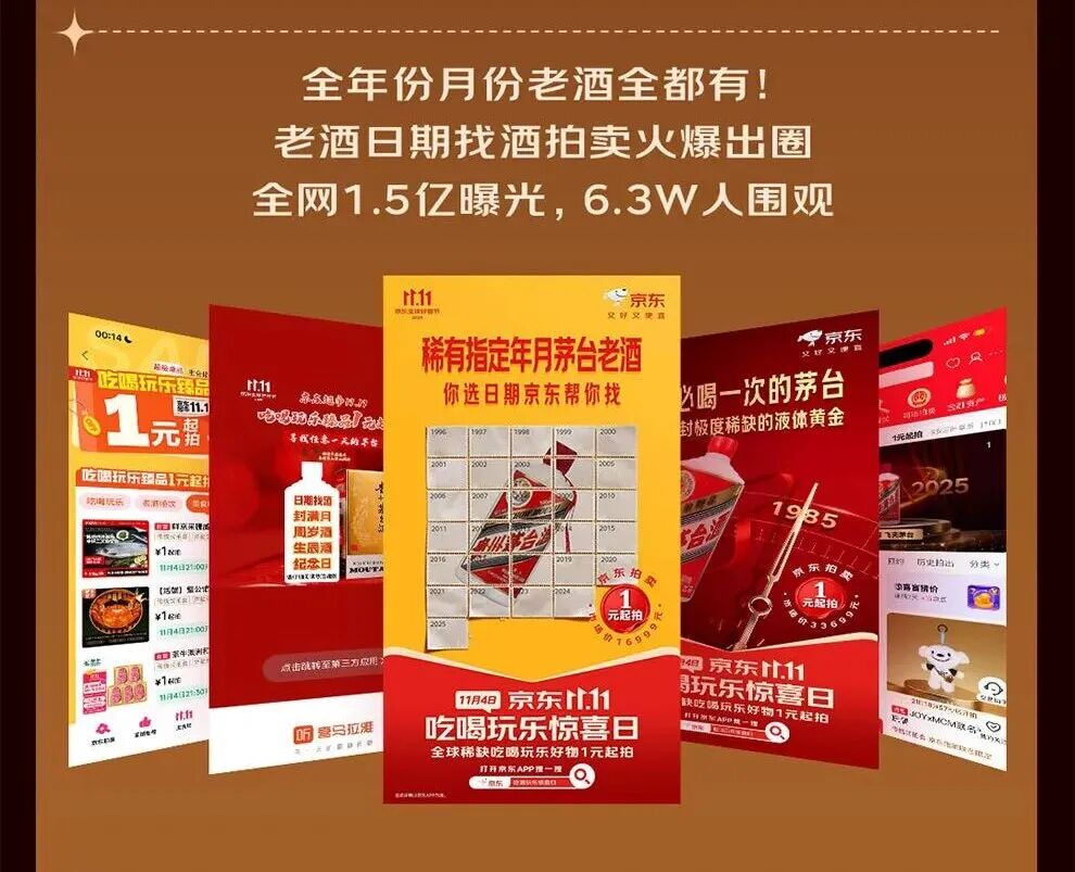 与此同时,老酒指定日期找酒拍卖活动火爆出圈,全网曝光量1.5亿,6.3万人围观,数据背后,也是消费者对于专属时间点的偏好,为老酒类消费市场附加价值需求的体现。