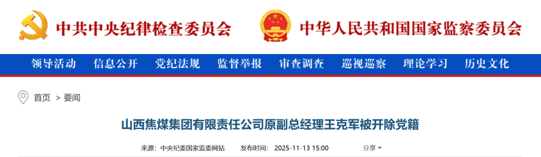 中央纪委国家监委网站11月13日消息,据山西省纪委监委消息:日前,经山西省委批准,山西省纪委监委对山西焦煤集团有限责任公司原副总经理王克军严重违纪违法问题进行了立案审查调查。