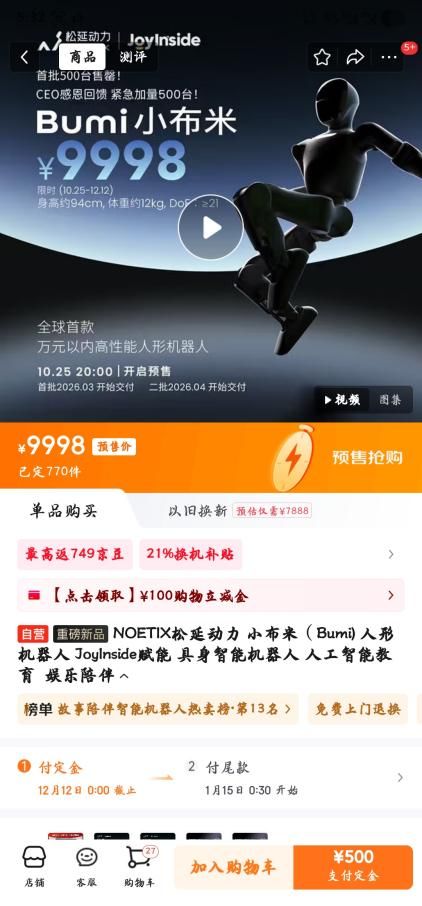 B端之外,C端订单的数量虽然较小,但反映出了消费端的接受度有所提升。以刚刚过去的“双11”为例,不少电商平台都上线了机器人产品。在某电商平台销售界面,松延动力的小布米机器人首批500台售罄后又补货了500台,目前仍在销售中。宇树机器人R1 Air在开售前也获得了3000多个预约抢购。