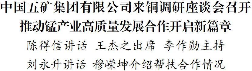 李作勋对陈得信一行来铜调研表示热烈欢迎,对中国五矿集团倾力帮扶铜仁表示感谢。他说,双方深化锰资源开发及锰系材料产业链合作,是贯彻落实党的二十届四中全会和习近平总书记重要指示精神的重大举措,是提高国家战略资源保障能力、推动锰资源“富矿精开”的具体行动。铜仁将更加珍惜缘分、牢记情分、延续福分,按照省委、省政府与中国五矿集团达成的重要合作共识,全力做好规划、用地、用电等服务保障,组建工作专班,项目化、清单化推动双方合作走深走实。
