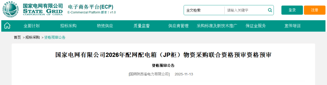 国家电网有限公司2026年配网配电箱(JP柜)物资采购联合资格预审资格预审公告