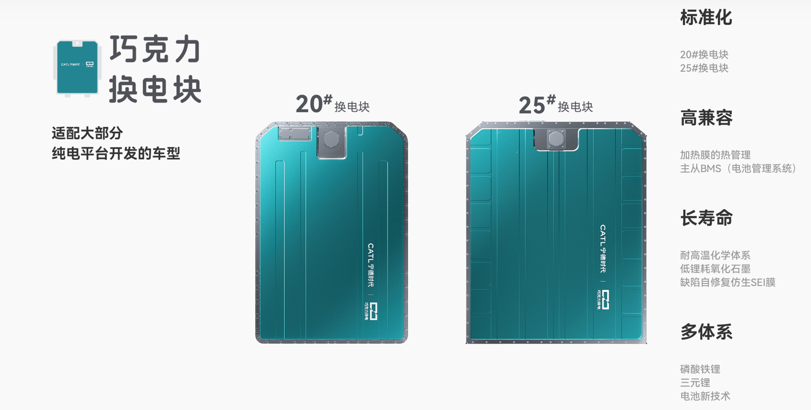 该方案提供20号和25号两种换电块,分别适配A0级与A/B级车型,配合磷酸铁锂和三元锂两种化学体系,为用户提供400至600公里不等的续航选择。