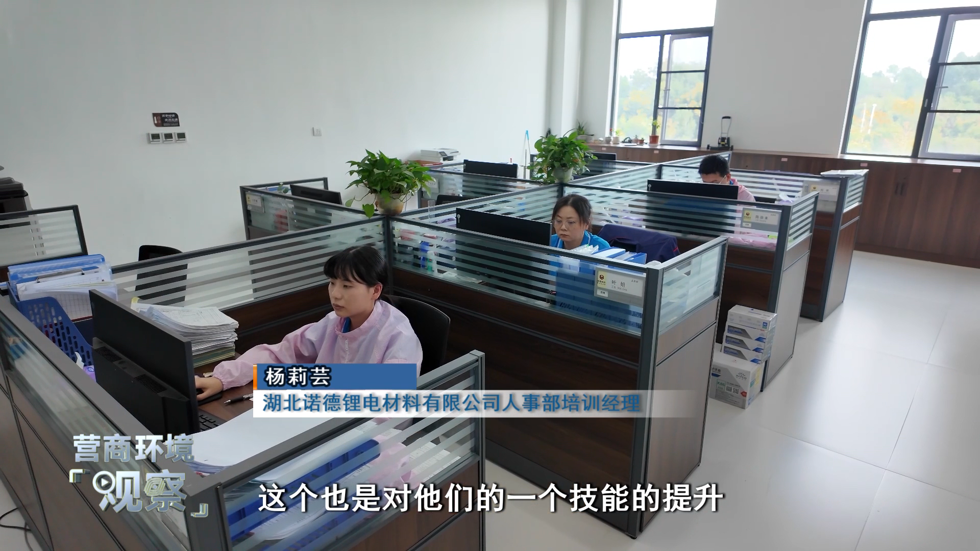 湖北诺德锂电材料有限公司人事部培训经理杨莉芸:最近也入职了湖比工程职业学院,还有湖北理工学院和其他院校的一些学生,都有来到我们公司进行一个实习,这个也是对他们的一个技能的提升,也是对我们后续员工人才培养的发展有一定的帮助。二厂马上就要开了,对招工大量的缺口也是起到了一定的帮助,让我们也缓解了一些压力,对我们目前黄石的营商环境还是比较满意的。