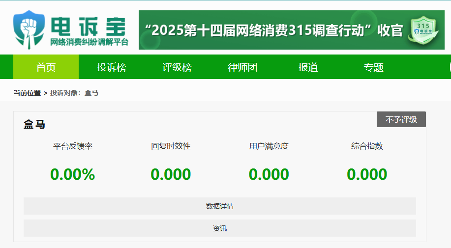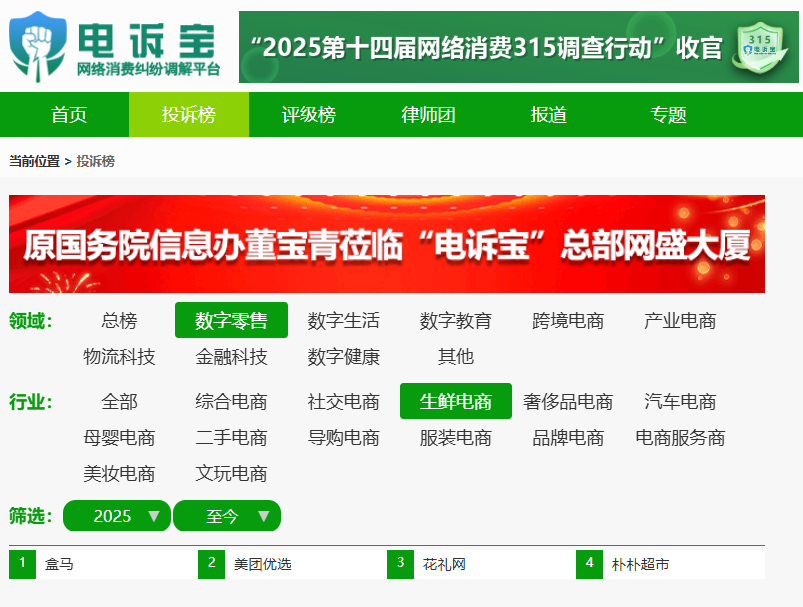 2025年至今,“电诉宝”受理投诉中涉及的生鲜电商领域用户有效投诉显示(依据投诉量排行),“盒马”排名第1位。最新评级为“不予评级”。除此之外,历年被投诉的类似平台还有:美团优选、花礼网、朴朴超市。