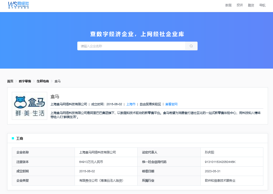 据网经社企业库(COP.100EC.CN)显示,“盒马”属于上海盒马网络科技有限公司,成立于2015年6月2日,法定代表人为孙庆阳。盒马鲜生是阿里巴巴旗下的自营生鲜及日用品零售连锁超市,自称是中国首家以数据和技术驱动的新零售平台和新零售先驱。