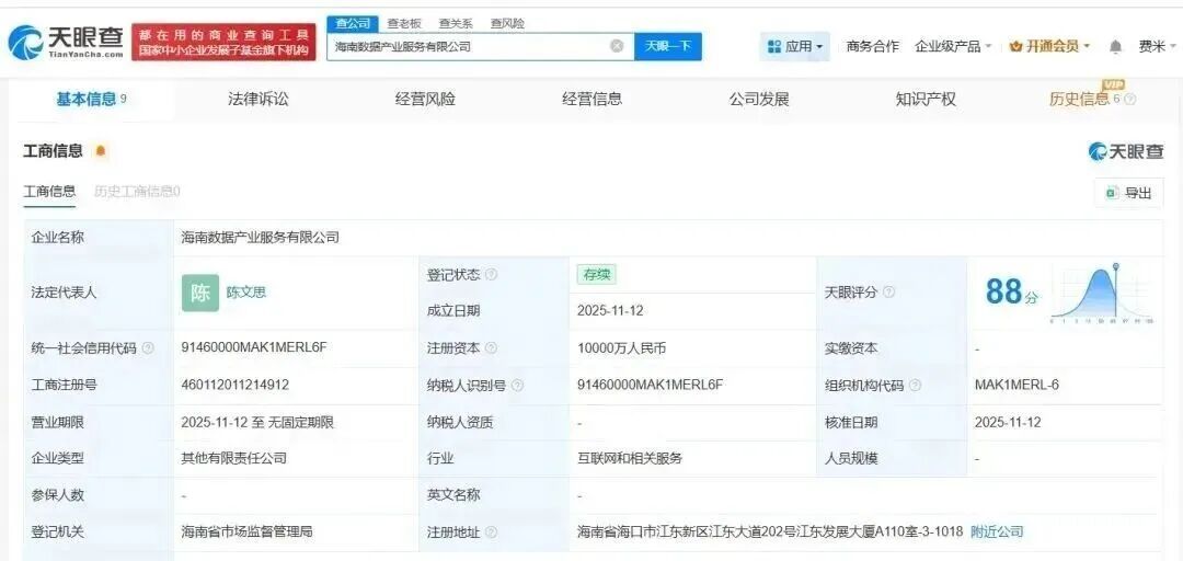海南数据产业服务有限公司于近日正式成立,注冊資本高达1亿元。