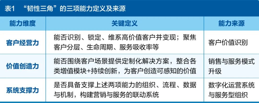 企业要想应对周期波动、维持发展韧性,必须具备三项基本能力:客户经营力、价值创造力、系统支撑力,这三项能力构成了一个相互支撑的“韧性三角”(见表1)。这三项能力构成代理企业能否摆脱“交易中介”角色、实现长期客户经营与价值创造的根本基础。它们并非锦上添花,而是企业转型过程中最为核心的结构性能力,缺一不可。