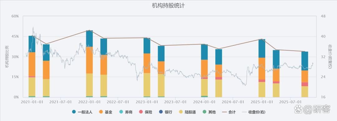 2021年末,基金持股比例为19.7%,全部机构合计持股49.6%,至2025年9月末,基金持股8.8%,机构合计持股33.9%,分别减少约10,9个、15.7个百分点。