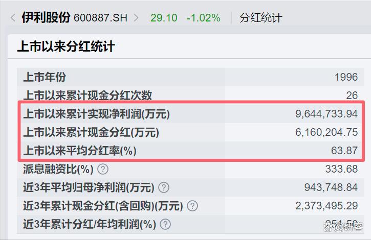根据 万得 , 伊利 上市以来累计实现净利润超过964亿元,累计现金分红616亿元,平均分红率接近64%。 伊利 将2025年至2027年分红率提高至75%,将比历史分红率高11个百分点。