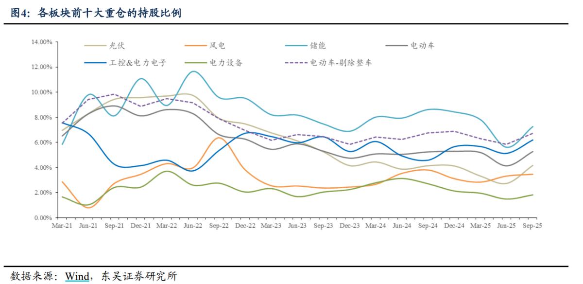 东吴证券研究报告显示,2025年三季度,主动基金经理持续挖掘新能源产业机遇,公募基金对电力设备与新能源板块的配置比例环比大幅提升。电动车、光伏、储能、工控、电网、风电六大板块持仓全线上升,成为当前机构资金重点关注的赛道。其中,储能板块环比上升1.65个百分点至7.25%。