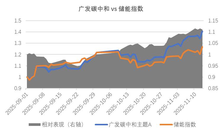其中,广发碳中和主题以74.51%的年内涨幅(截至 11月17日),超越了同期储能指数表现,并且在10月以来显著跑赢储能指数,获得了明显的超额收益。