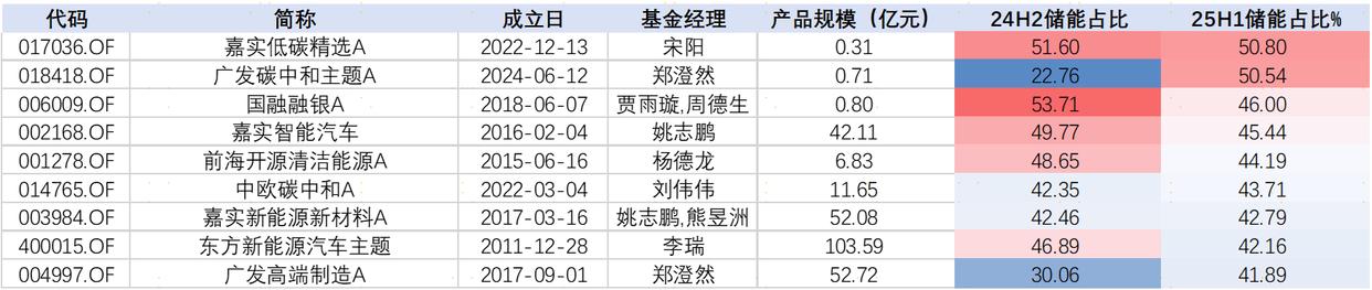 具体到储能细分赛道来看,储能占比较高的主动管理基金,有嘉实低碳精选、广发碳中和主题等,截至上半年末的占比达到五成。此外,同样由郑澄然管理的广发高端制造,储能占比也达到四成。