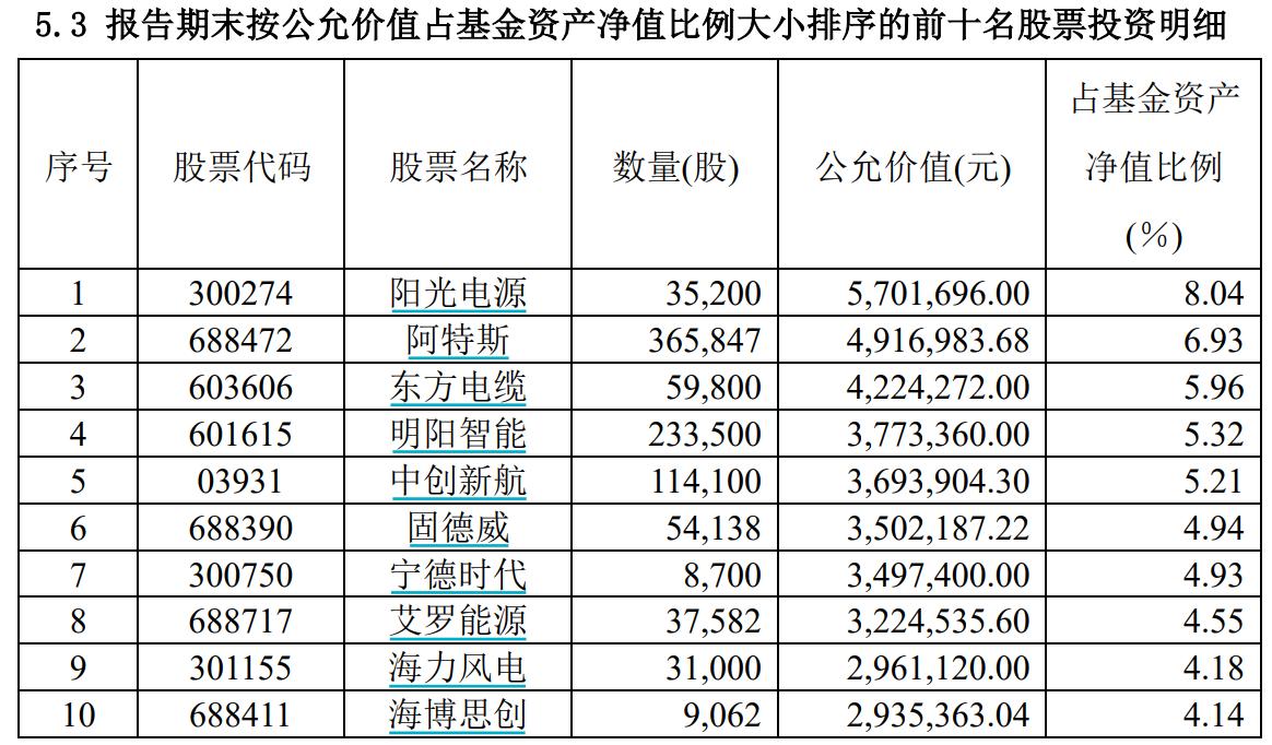 从持仓个股来看,2025年三季度,该基金前十大重仓股包括了阳光电源、阿特斯、东方电缆、明阳智能、固德威、海力风电等,储能、风电、光伏板块较为集中。