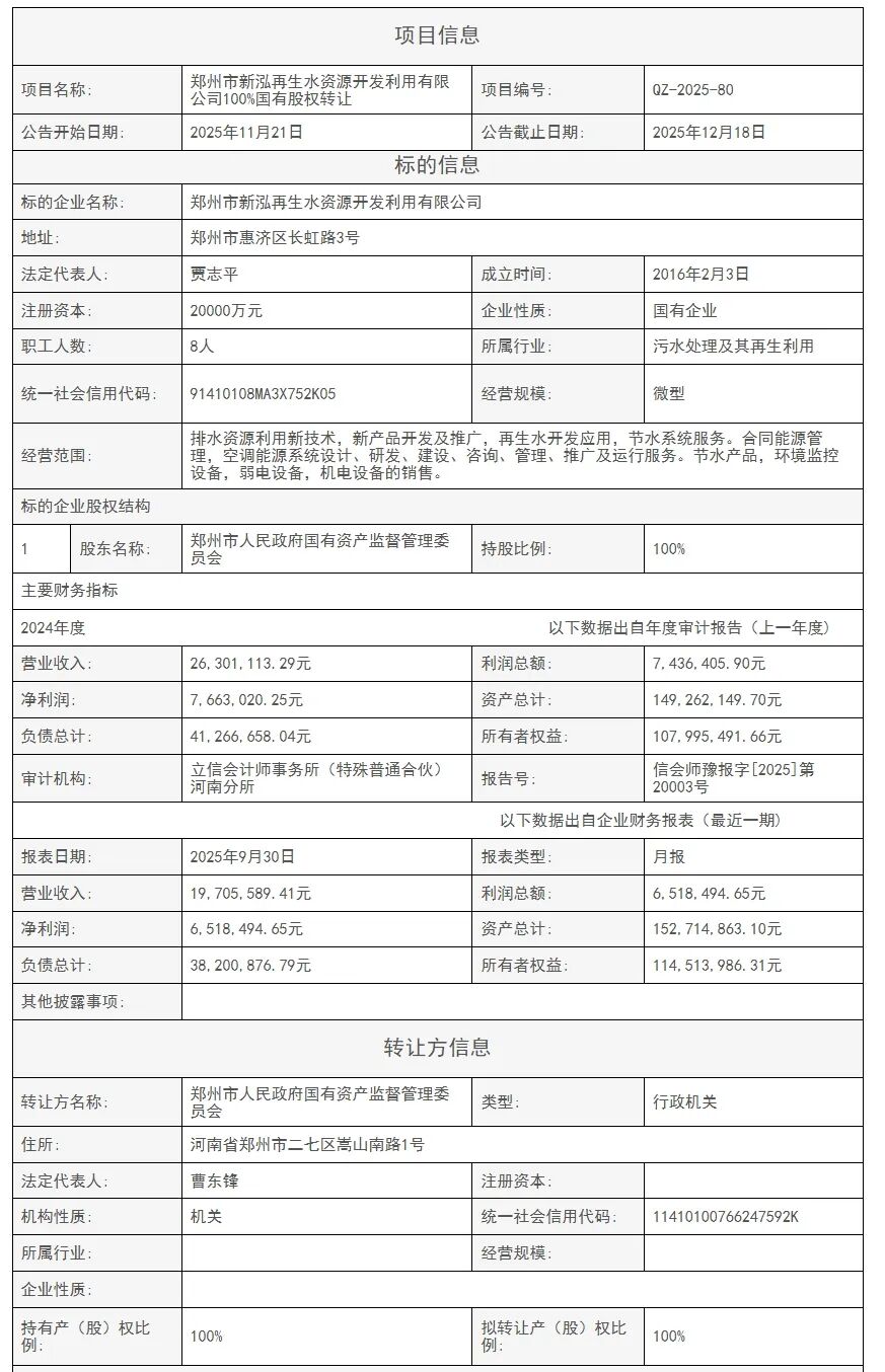 《环保水圈》获悉,近日,根据郑州市人民政府关于2家公司股权资产盘活事项的批复,郑州市格沃环保开发有限公司、郑州市新泓再生水资源开发利用有限公司同日挂牌转让100%国有股权。
