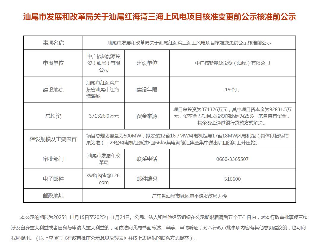汕尾红海湾三海上风电项目建设单位为中广核新能源投资(汕尾)有限公司,建设地点位于汕尾市红海湾广东省汕尾市红海湾海域,总投资371326万元,建设年限19个月。项目总规划容量为500MW,拟安装12台16.7MW风电机组与17台18MW风电机组(具体以招标结果为准),29台风电机组通过8回66kV集电海缆汇集至集中送出项目的海上升压站。