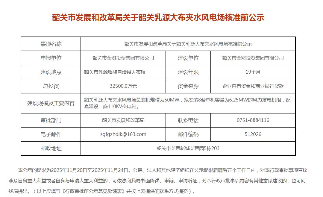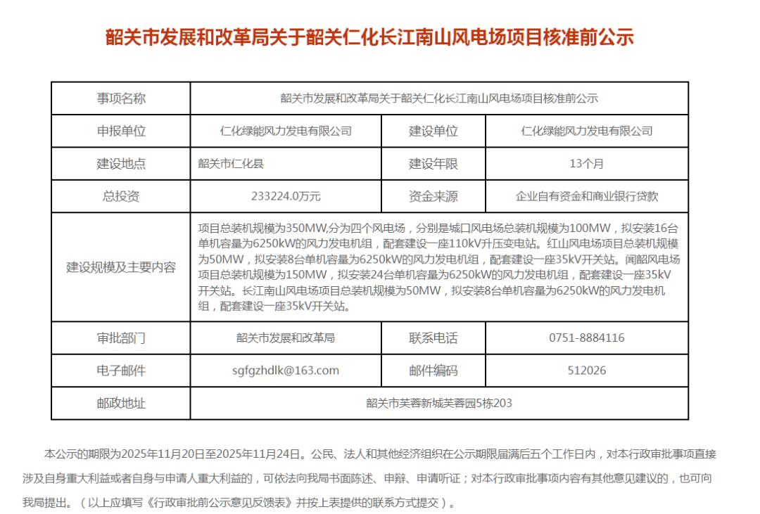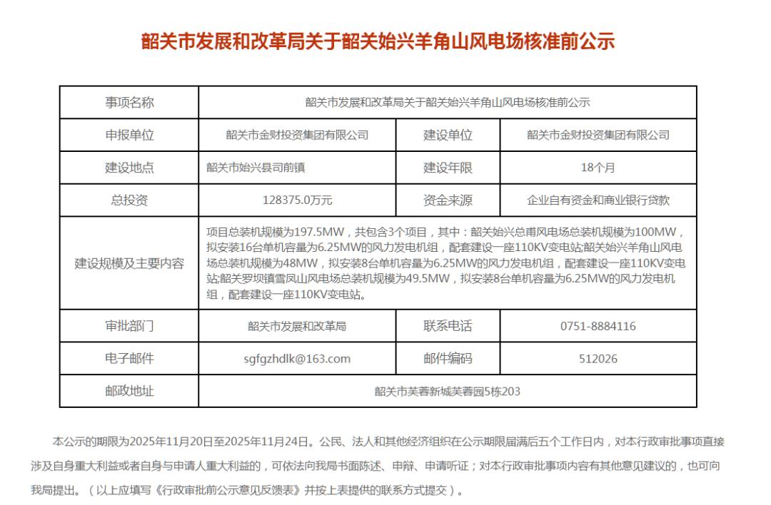 广东1.11GW风电项目核准前公示:涉及中广核、韶关产投集团等!
