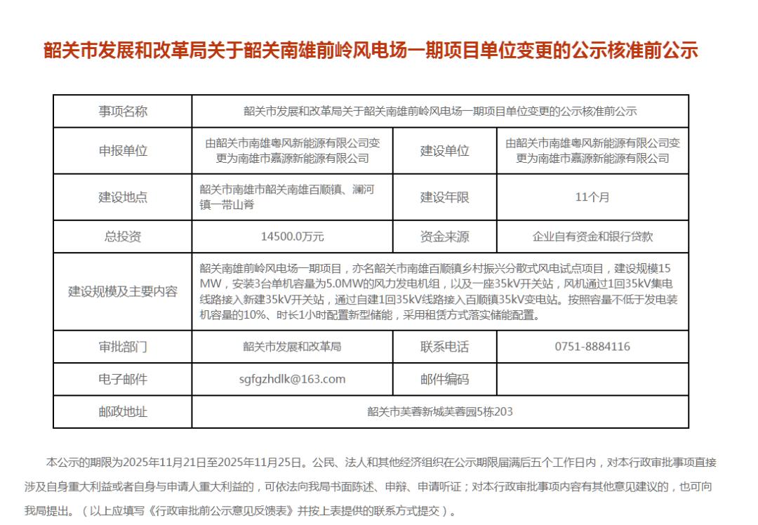 根据公示,韶关南雄前岭风电场一期项目建设单位由韶关市南雄粤风新能源有限公司变更为南雄市嘉源新能源有限公司,建设地点位于韶关市南雄市韶关南雄百顺镇、澜河镇一带山脊,总投资14500万元,建设年限11个月。项目建设规模15MW,安装3台单机容量为5.0MW的风力发电机组,按照容量不低于发电装机容量的10%、时长1小时配置新型储能,采用租赁方式落实储能配置。