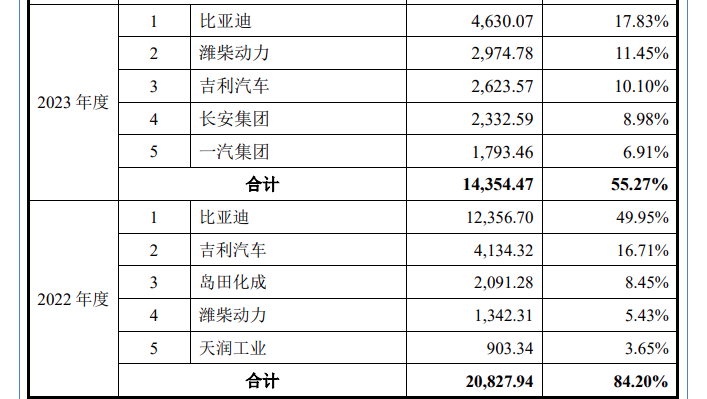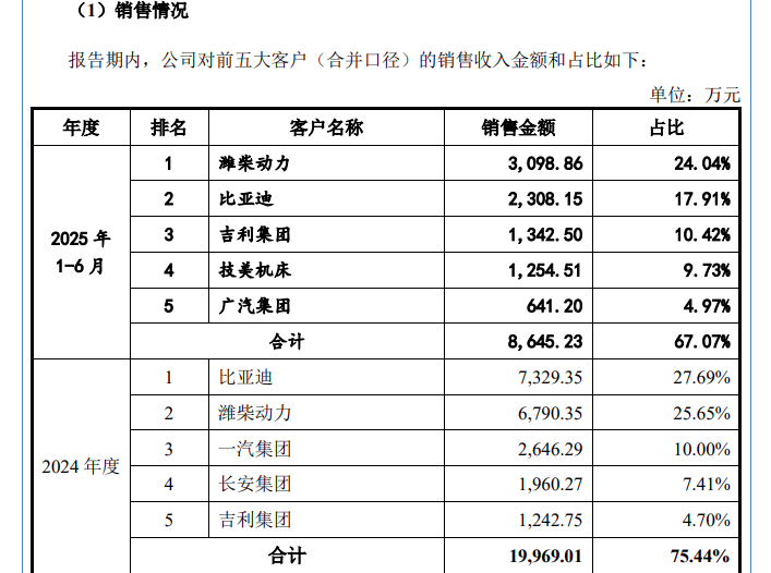 客户结构上,2022年至2024年,比亚迪连续三年为大鹏工业第一大客户,销售金额分别为12356.70万元、4630.07万元和7329.35万元,占营业收入的比例分别为49.95%、17.83%和27.69%。2025年上半年,其客户结构出现变化,潍柴动力以3099万元的销售金额、24.04%的占比跃居第一,比亚迪则以2308万元销售金额、17.91%的占比位列第二。