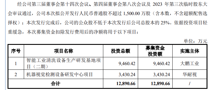 本次发行战略配售股份合计150.00万股,占本次发行规模的10.00%,发行价格为9.00元/股,战略配售募集资金金额合计1350.00万元,募集资金净额达11953.76万元。最新版招股书显示,本次募集资金将全部聚焦主营业务,分别投入智能工业清洗设备生产研发基地项目(二期)、机器视觉检测设备研发中心项目,精准匹配下游客户在高精度工业清洗、机器视觉检测等工序的智能化转型升级需求,为企业技术迭代与产能扩张注入动力。