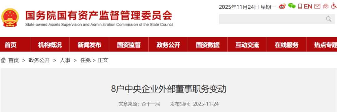 据国务院国有资产监督管理委员会网站11月24日消息,8家央企外部董事职务变动,中国石油化工集团有限公司、中国中化控股有限责任公司均在此次变动之列。